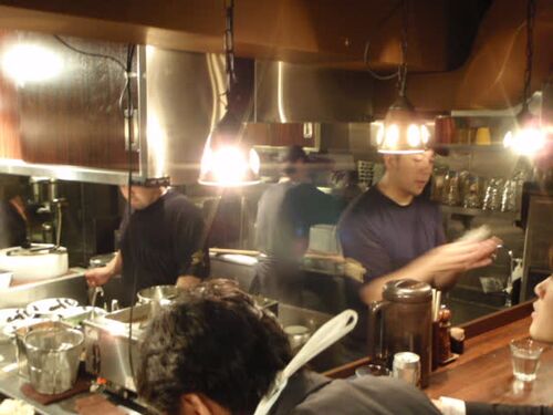 2004年2月に初めて訪れた、御徒町に出来た麺屋武蔵 武骨。 はじめイカ墨のラーメンと、注文の度に寸胴からチャーシューと取り出して、チャイニーズ包丁で、勢い良くブッタ切るスタイルに衝撃を受けました。 あと厨房と客席の間隔がすごく近くて、麺の湯…