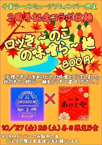 【千葉ラーメンミュージアム2周年記念コラボ】【千葉ラーメン総選挙第3位】「ら~麺あけどや@市川」今回はメンバーオンリーの限定10/27,10/28、各日5食 明日からのフェイスブックの人気公開グループ「千葉ラーメンミュージアム」の特別限定らーめん。 あな…
